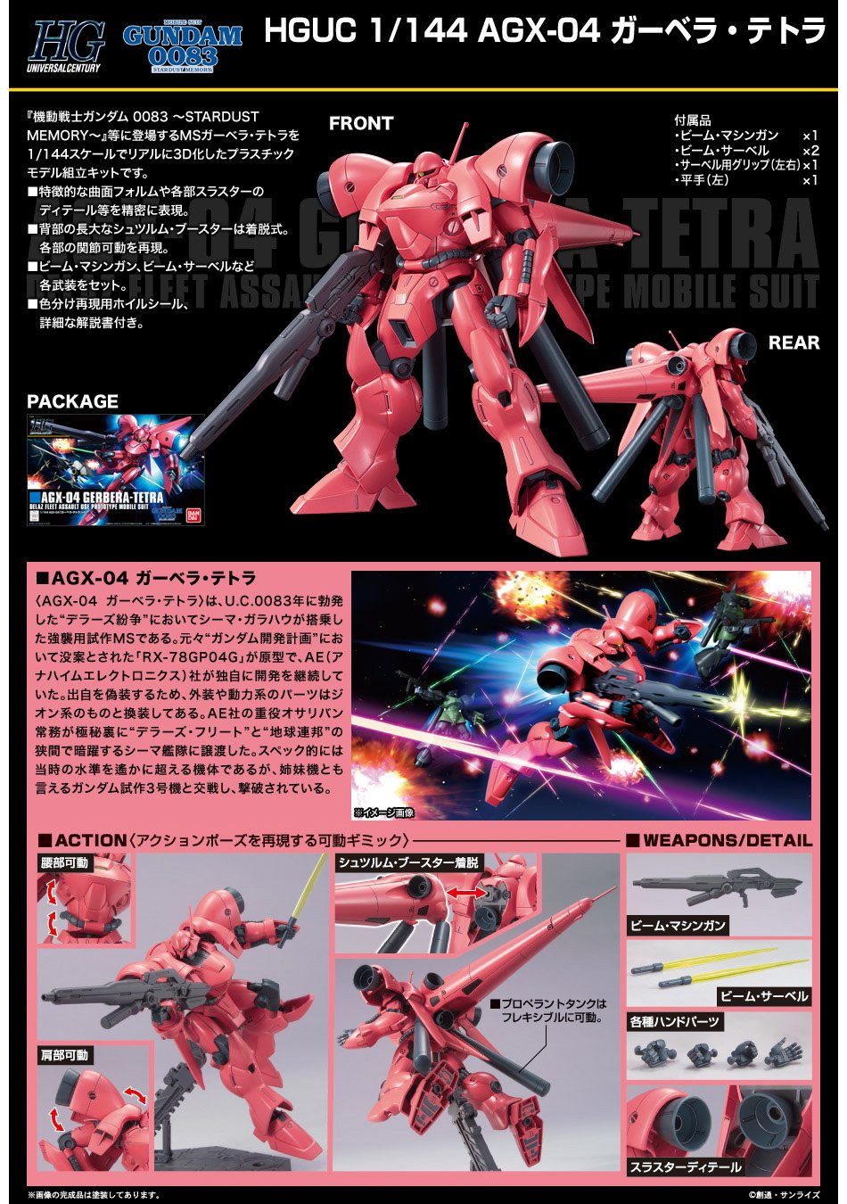 Model Gerbera Tetra z Gundam 0083: Stardust Memory, pilotowany przez Cima Garahau. Powstały z niedokończonego GP04 Gundam „Gerbera” oddanego Zeonowi przez lojalnych mu członków Anaheim. Gerbera Tetra pełni tę samą funkcję jaka była zaplanowana dla GP04 – szybki atak. Z tej racji na wyposażenie składa się karabin i dwa miecz energetyczne oraz karabiny maszynowe w przedramionach.